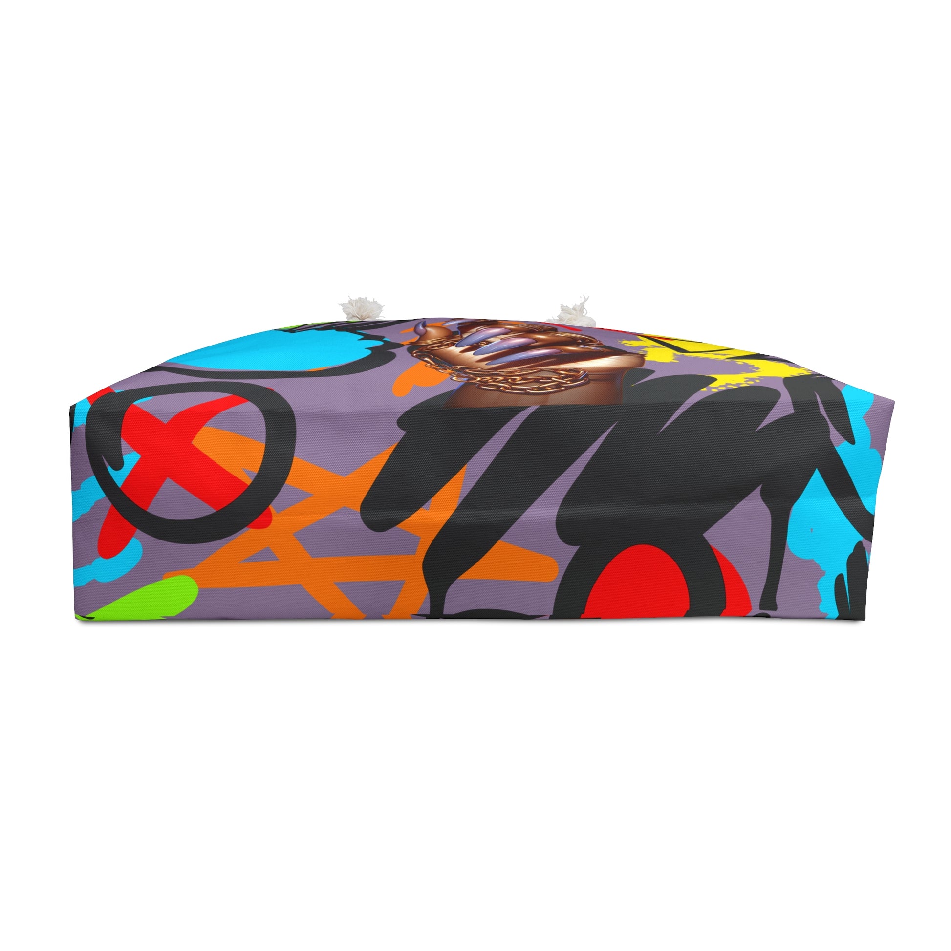 Turn heads before you even hit the gate. This bold weekender tote features an urban graffiti background and a fierce feminine hand with long nails gripping a gold chain—because travel is a whole vibe. Built to hold everything from your kicks to your glow kit, this oversized bag makes a statement whether you’re beach-bound or city-hopping.